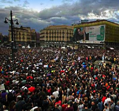 A Praça do Sol, no centro de Madrid, está repleta de milhares de pessoas num protesto anti -regime convocado pelas redes sociais e por SMS. Há uma semana que manifestantes saem à rua em várias cidades de Espanha. Amanhã há eleições regionais e municipais.